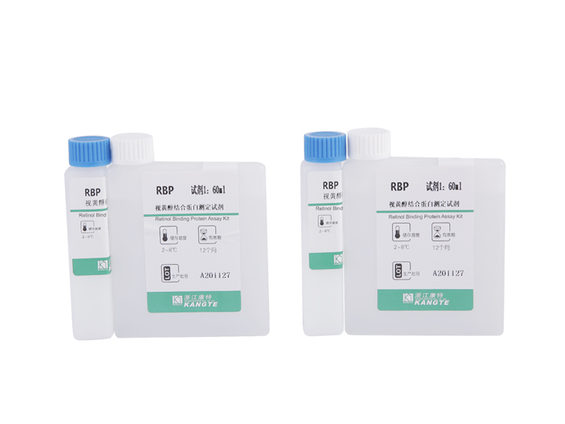 Is éard atá sa trealamh measúnaithe Próitéin Ceangailteacha Retinol ná pláta 96-tobar le próitéin athchuingreach atá sonrach do RBP. Tá an próitéin biotinylated agus réamhbhrataithe. Ina dhiaidh sin níochán le maolán níocháin. Ar aghaidh, cuirtear an Coimpléasc Streptavidin-Peroxidase (SPX) leis na toibreacha. Baintear comhchuingeacha neamhcheangailte le maolán níocháin. Léirítear imoibriú einsímeach an Streptavidin-Peroxidase ag táirge dath gorm. Éiríonn an dathú TMB buí nuair a thagann sé i dteagmháil le tuaslagán stad aigéadach.